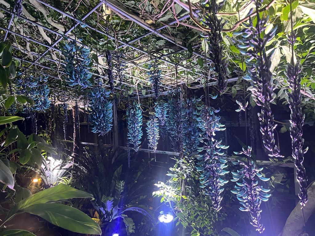 世界を旅する植物館の熱帯アジアゾーンでは、約30年かけて棚状に伸びたヒスイカズラを展示しています。3月中旬から4月中旬まで約200房のヒスイカズラが順次開花。美しいヒスイカズラのトンネルをくぐることができます。
