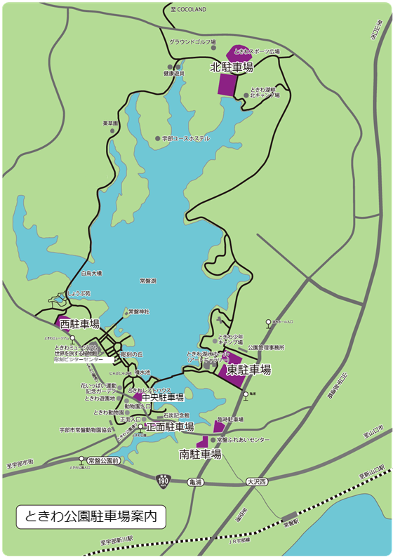 正面入口総合インフォメーション(正面駐車場)、ときわ動物園入口(中央駐車場)、ときわ湖水ホール(東駐車場)、ときわミュージアム(西駐車場)